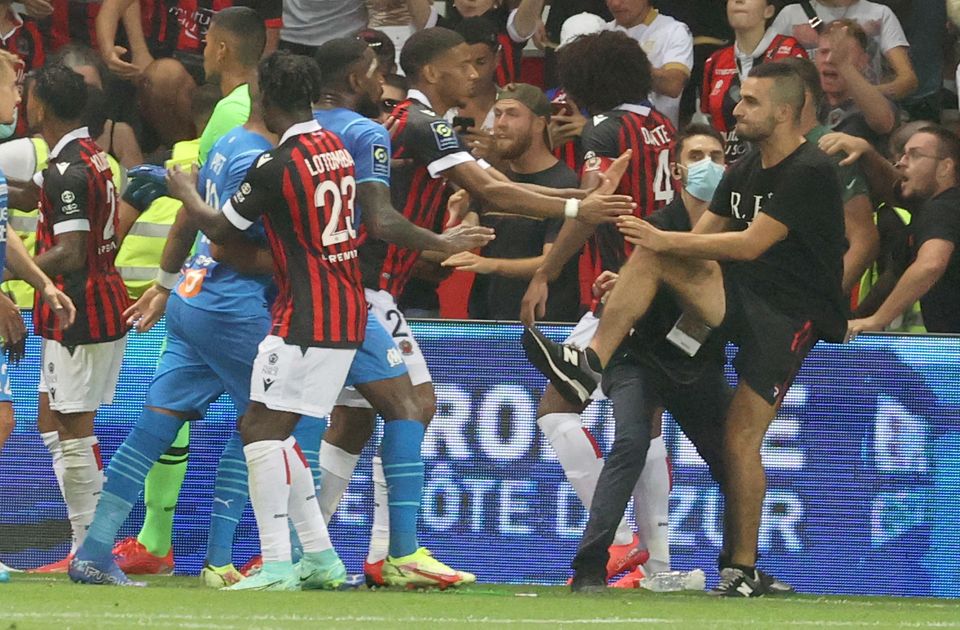 The ligue 1 clash between nice and marseille was abandoned in the second half at the allianz riviera on sunday after marseille players clashed with home fans, who pelted them.